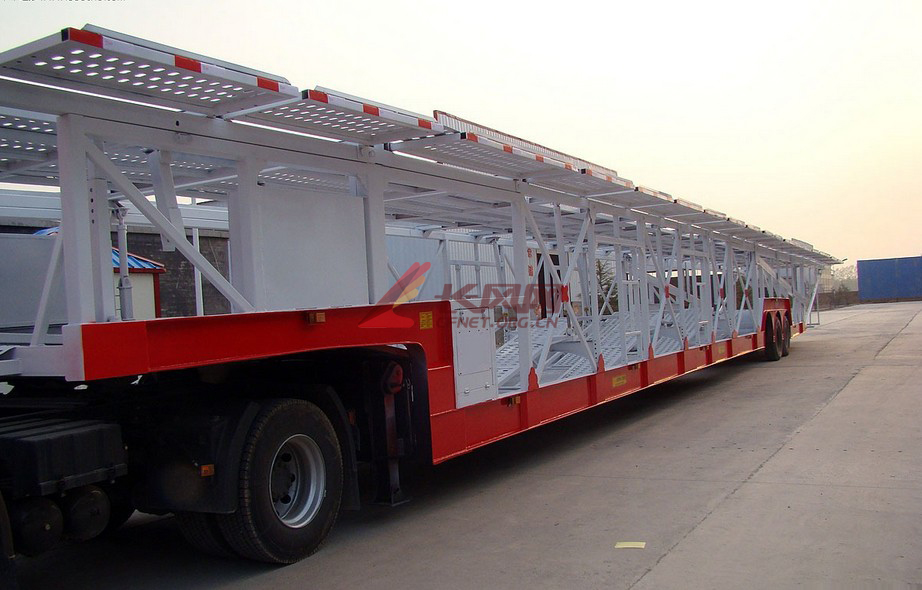 车辆运输车根据结构形式共有三个型号,分别为双桥双胎、双桥单胎、单桥双胎;根据外型分为骨架式、半封闭式、封闭式。 轿运车又名车辆运输车、大怪、二怪等。 轿运车可根据客户需求做成长度不等,边框为焊接工字梁,整个车身全部采用全自动埋弧焊和二氧化碳气体保护焊。焊接完成后进行喷丸处理,以消除焊接应力并提高漆面的附着力,使质量稳定,外型美观。上层底架可分为二至三块,用手拉葫芦和油缸调节高度。封闭式前片采用冲压小波纹...