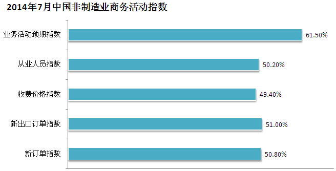 中国物流与采购联合会、国家统计局服务业调查中心发布的2014年7月份的中国非制造业商务活动指数54.2%,环比回落0.8个百分点。